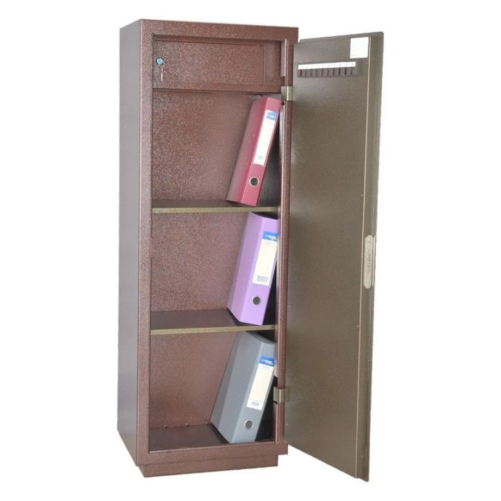 Сейф односекционный, оснащен двумя съемными полками и Трейзером. В двери установлен ключевой 8-ми сувальдный замок ЗАО «Про-Сам» г. Рязань или аналогичный замок другого производителя.